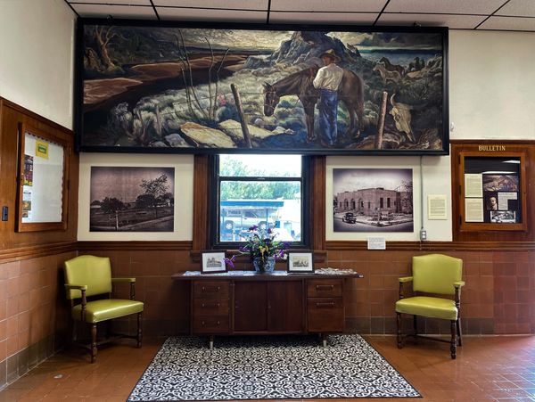On post office walls across the U.S. are scenes reflecting America's history and way of life. Post offices built in the 1930s and early 1940s during Roosevelt's New Deal were decorated with images of the "American scene." “Scenes Along the Rio Grande” was designed for the old Mission Post Office.